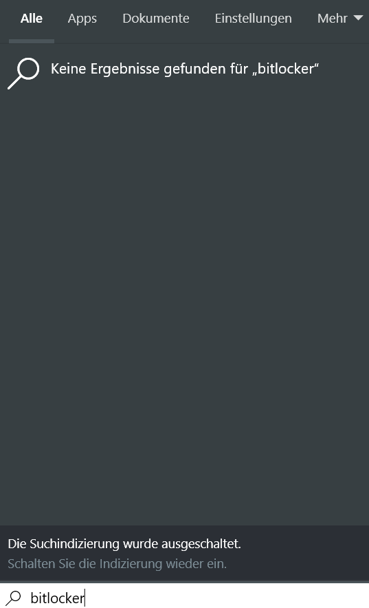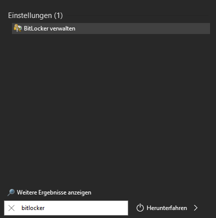 Der Status vom Bitlocker lässt sich relativ leicht prüfen; einfach den Begriff Bitlocker ins Startmenü hämmern. Wer will, darf aber auch gerne tippen...