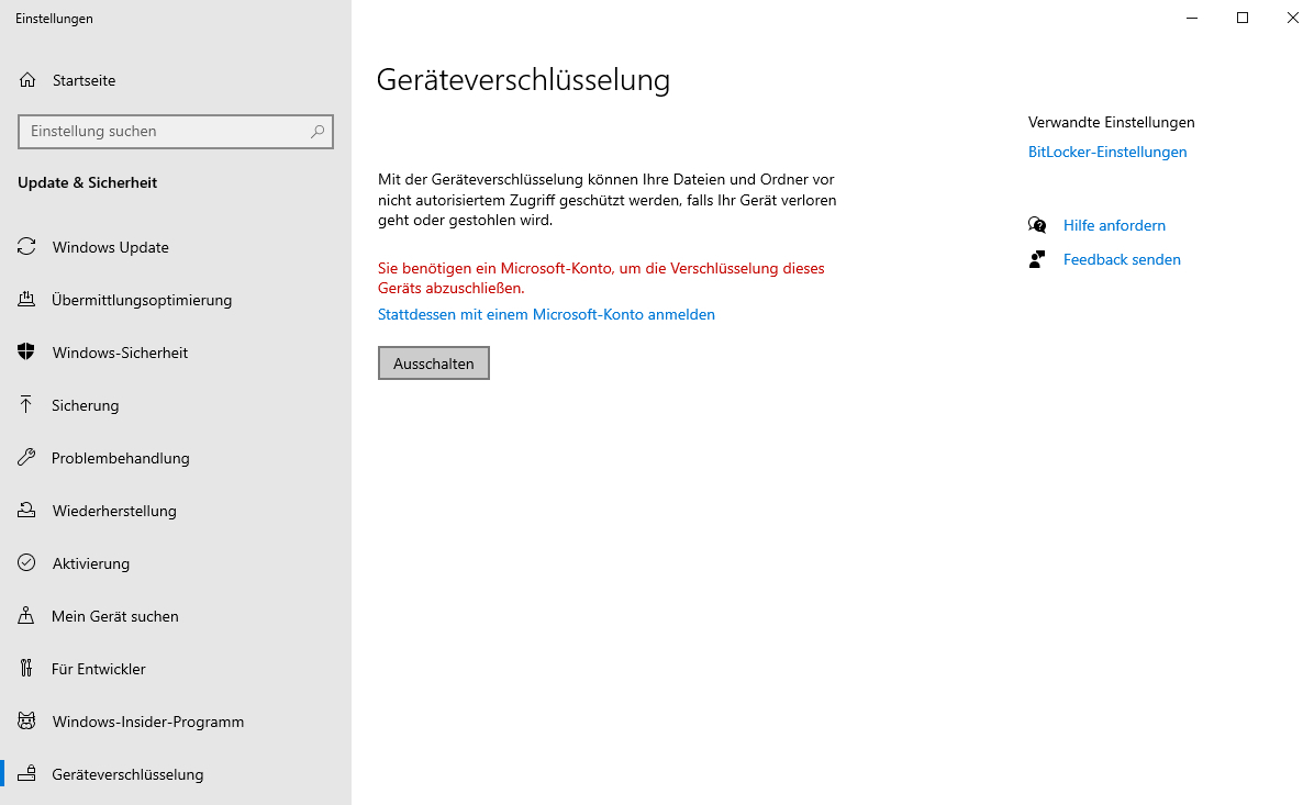 Diese Option wird nur angezeigt, wenn BitLocker für Ihr Gerät verfügbar ist. Die Funktion steht für Windows 10 Home Edition nicht zur Verfügung.