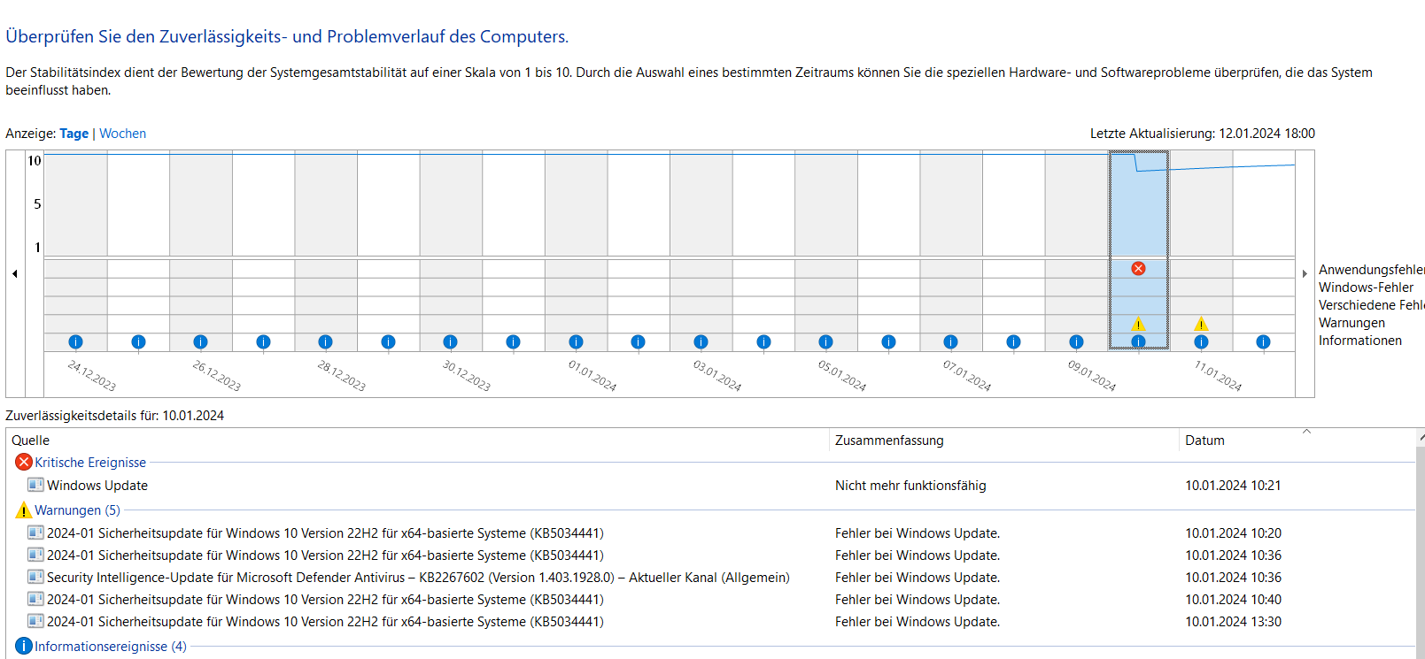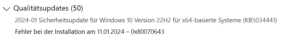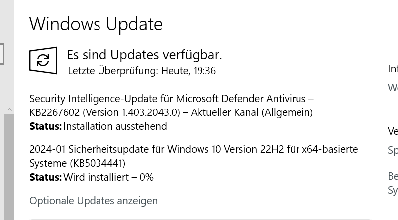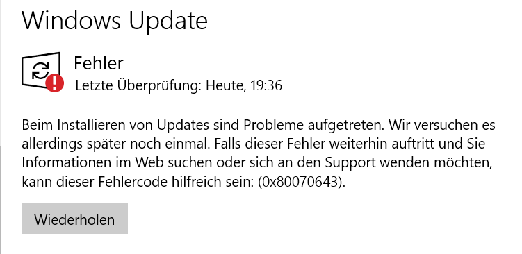 Das wird wohl erst passieren, wenn das fehlende Update installiert ist.