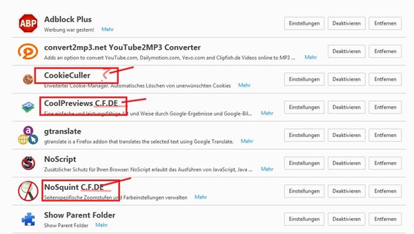 Edit: Ich sehe gerade, dir geht es nur um Cookieculler. Ohne Zusatz scheint das eine nichtsignierte AMO-Version zu sein. Auf AMO ist Cookieculler signiert und sollte den Zusatz 1.signed haben, auch unsere Forumsversion ist signiert und sollte den Zusatz C.F.DE haben. Entferne deine Version und installiere dir die Forumsversion.