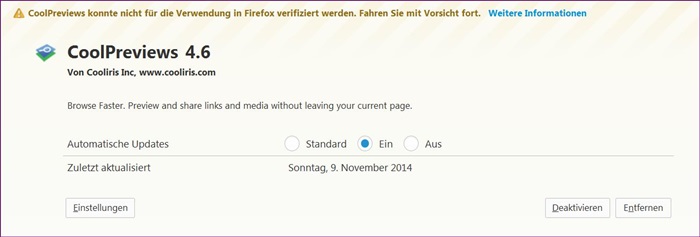 Dann hast du da die normalen Versionen von AMO. Die mit Zusatz C.F.DE sind hier aus dem Forum camp-firefox.de. Die Forumsversionen sind ebenfalls signiert. Allerdings weiß ich nicht genau, wie sich das mit dem automatischen Update verhält, d. h., ob C.F.DE-Versionen durch normale AMO-Versionen überschrieben werden können. Vielleicht weiß das Endor. Entferne die AMO-Versionen und installiere dir die Forumsversionen: