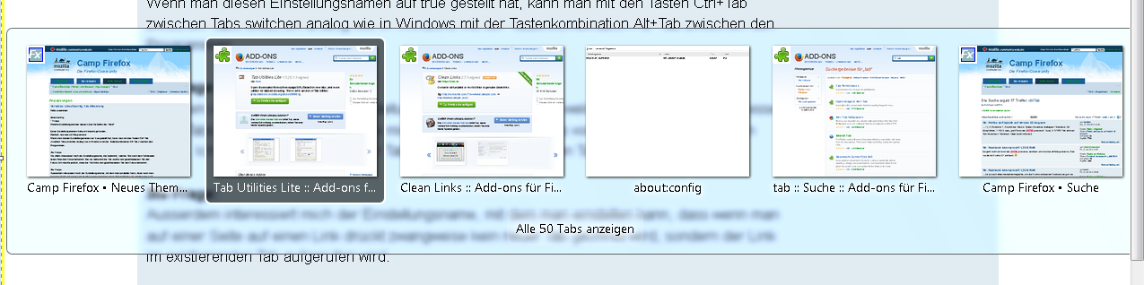 Ja, ich kenne die Erweiterung "Tab Utilities Lite". Doch ich ziehe es vor, die Parameter ohne Add-on anzupassen. (Ausserdem schient dort im Register "Tab Closing", Abschnitt "Ctrl Tab" die Funktion "Ctr+Tab to navigate tabs in most recently used order" nicht zu funktionieren. Aber dafür habe ich ja jetzt eben einen Ersatz gefunden (-> about:config; browser.ctrlTab.previews))