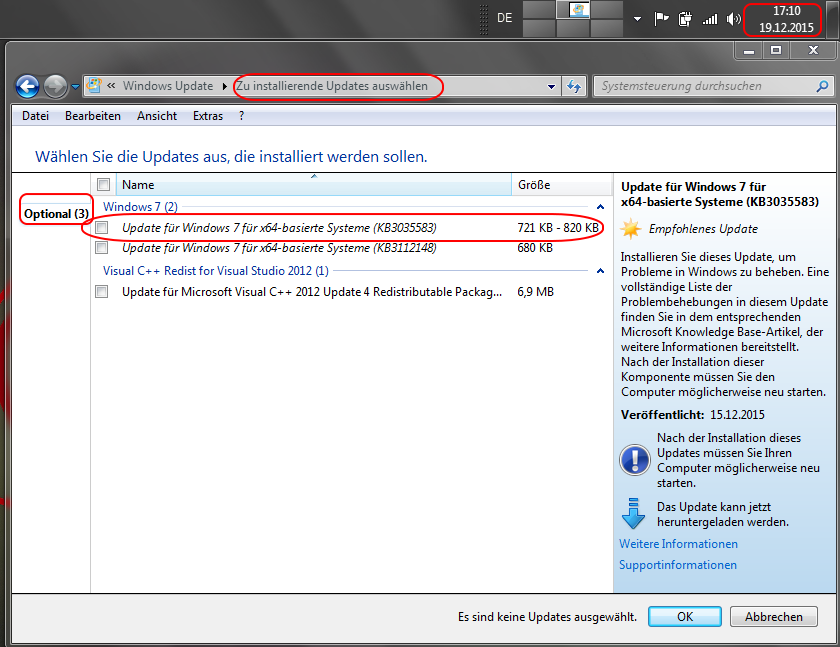 [attachment=2]Bild_2015-12-18---11-12-38-WindowsUpdate.png[/attachment]Heute wieder geguckt und siehe da: Es ist als optionales Update gelistet und bei den ausgeblendeten Updates ist es verschwunden