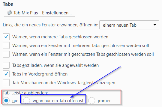 Wenn Du Tab Mix Plus verwendest, teste mal die blau umrandete Einstellung.