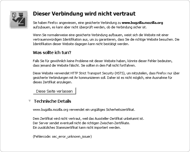 Zertifikat-Aussteller für alle https Seiten von Mozilla (bugzilla, support, addons...) sei unbekannt! Ich kann darüber hinaus nicht das Zertifikat herunterladen (Option nicht angeboten) und kann nicht sehen wer Aussteller ist.