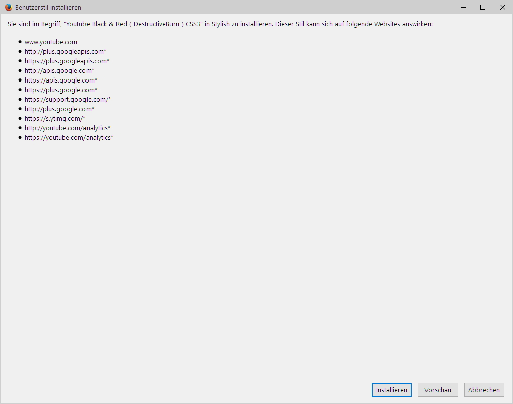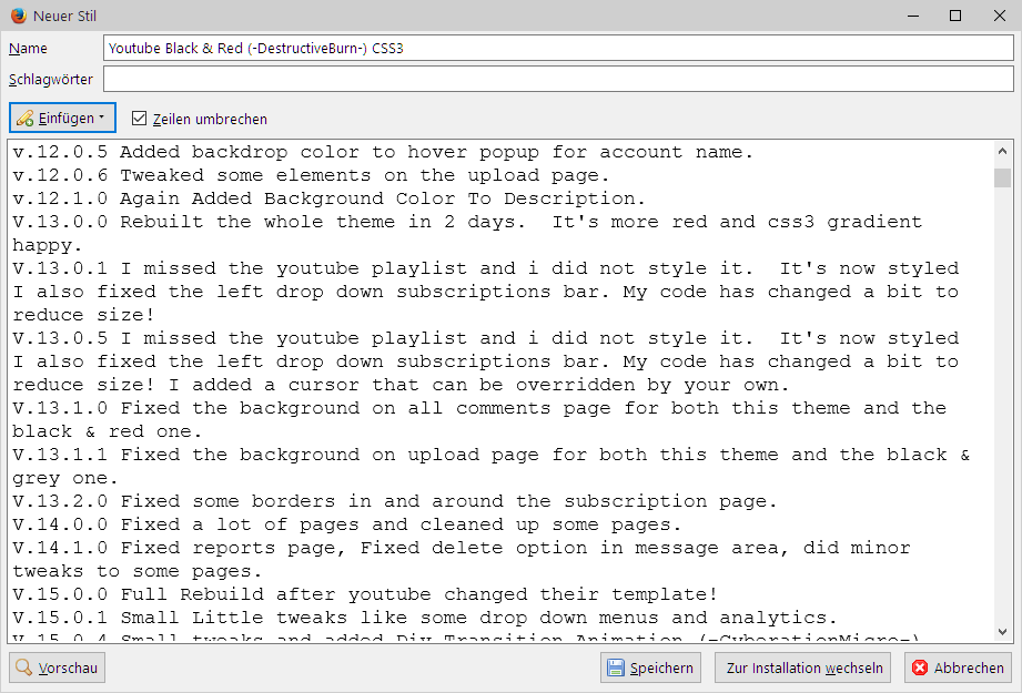 ich habe jetzt einen neuen Style unter userChromeJS 2.0 Stylish 2.0.2.1 installieren wollen und bemerkt, dass das Installationsverhalten ganz anders geworden ist. Kann ich es wieder so einstellen, dass es wie unter userChromeJS 1.7 ist? Damit meine ich z.B. die Meldung "Sie sind im Begriff...." ( die brauche ich nicht) und ich möchte vor der Installation auch wieder den Quelltext sehen.