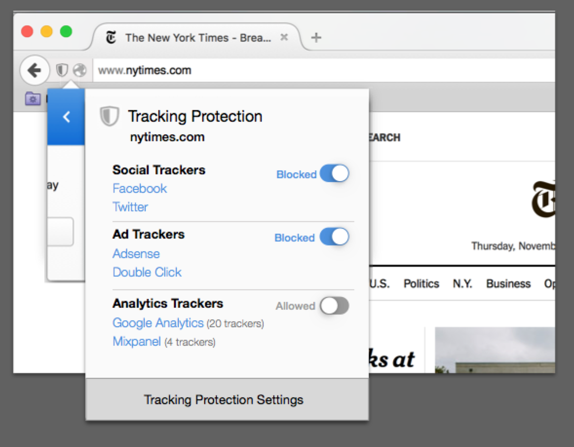 2. Firefox besitzt seit Version 42 einen eingebauten Tracking-Schutz für den privaten Modus. Der Tracking-Schutz soll natürlich noch besser in zukünftigen Versionen werden. Neue Mockups zeigen eine Unterscheidung zwischen "Social Trackers", "Ad Trackers" und "Analytics Trackers" (#1218891).