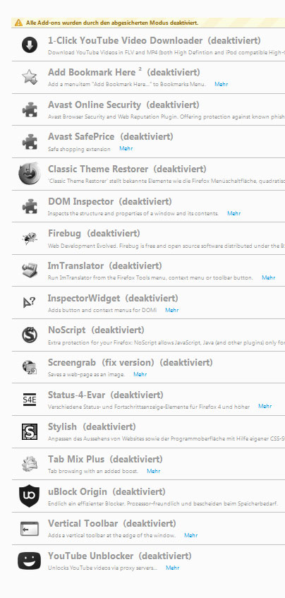 Du hast den ImTranslater und somit wohl auch die ImToolbar installiert, das kommt auf's Gleiche raus! Was sich sonst noch auf deinem Rechner tummelt, das solltest Du besser dem Adwcleaner und Malwarebytes entscheiden lassen. Die Add-ons von Avast würde ich aber so oder so über die Systemsteuerung deinstallieren, die bringen nämlich nichts!