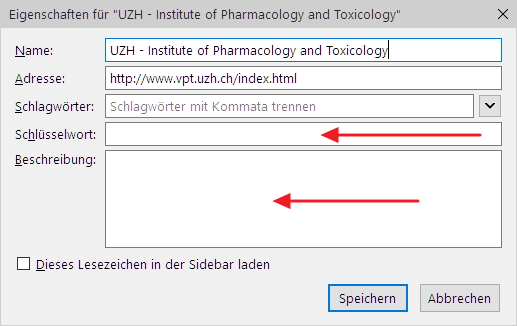 es wäre gut, wenn man für die einzelnen Lesezeichen (siehe Grafik 1) Schlüsselwörter oder/und eine Beschreibung vergeben könnte, die man dann ins Suchfeld eingibt (siehe Grafik 2), um dann das Lesezeichen zu finden. Wieso funktioniert das nicht? Und gibt es dafür eventuell ein Script oder eine Erweiterung?