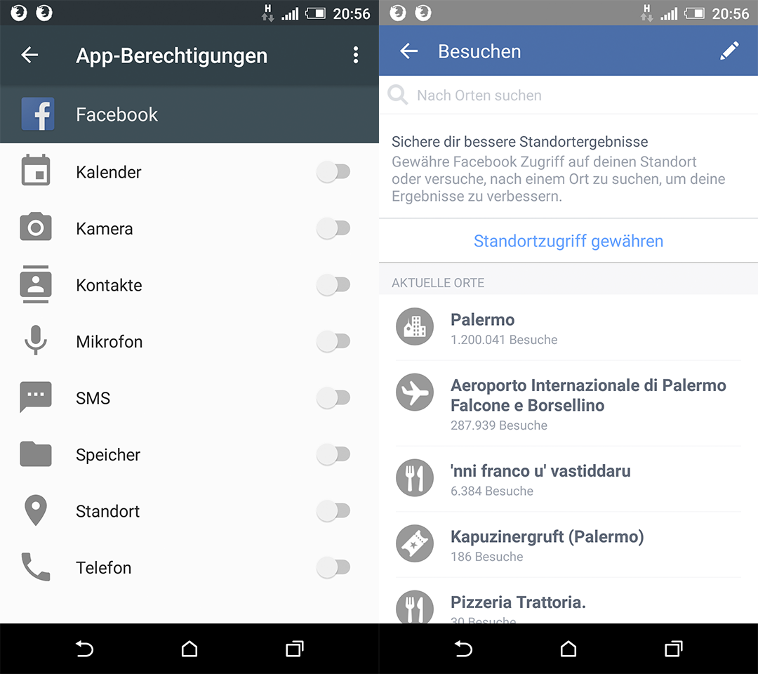 Ich hab mal die Berechtigungen der Facebook-App überprüft. Alle Berechtigungen wie Standort, Kontakte etc. waren standardmäßig deaktiviert, ich hab nichts (!) von Hand umgestellt. Und selbst wenn, ich kann alles nachträglich ändern. Bitte sieh dir ein aktuelles Android an, bevor du falsche Dinge als Fakten über Android darstellst.