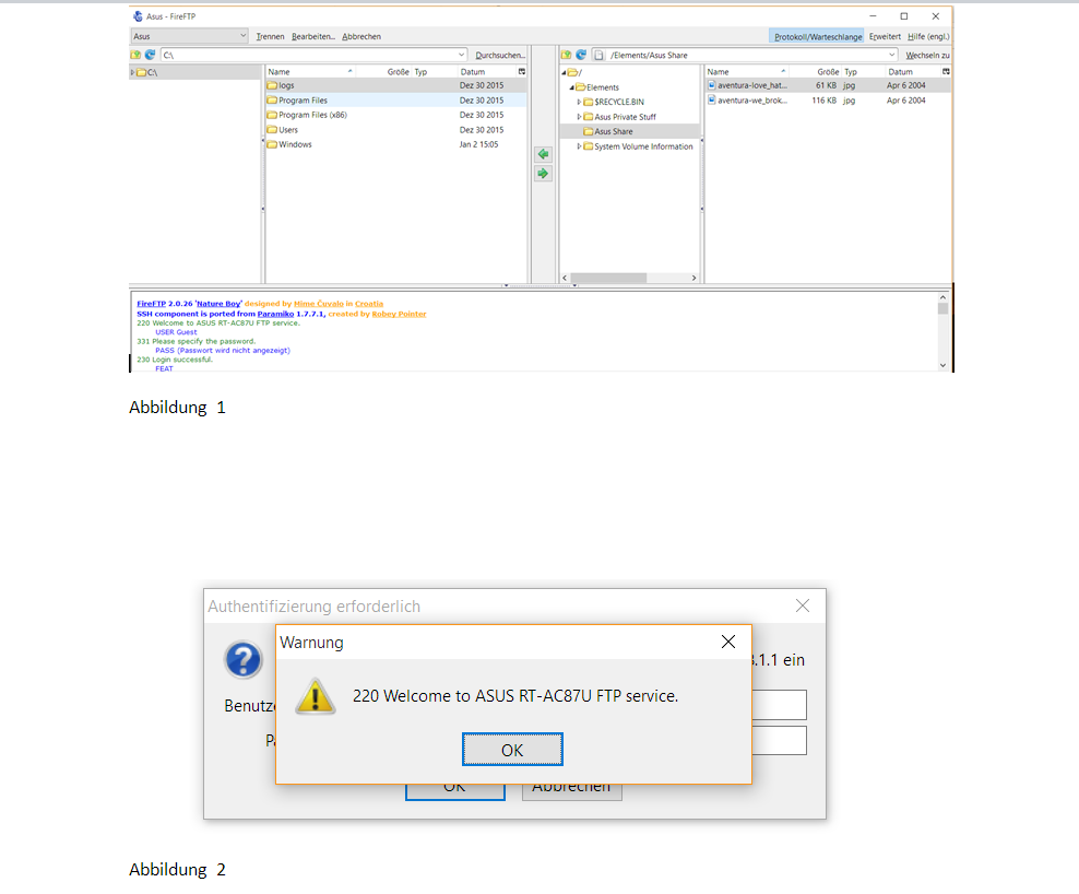 Ich habe auf meinem Router einen FTP Server eingerichtet. Wenn ich diesen mit Fire FTP anspreche, funktioniert auch alles - Abbildung 1. Nun müsste dieser doch auch direkt über Firefox ohne Fire FTP angesprochen werden können. Hier erscheint jedoch eine Warnung - Abbildung 2. Ich kann im Anschluss die Logininformationen zwar eingeben aber das Fenster bleibt danach leer.