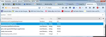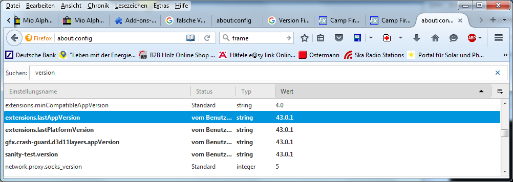 Was mir dann noch aufgefallen ist: Beim Desktop ist die Version 43.0.1 in der Anzeige, obwohl in den Einstellungen steht, das FF aktuell ist. Der Laptop zeigt korrekt 43.0.3. Wenn ich in der config nachschaue und nach Version suche gibt es einige Einträge, die als Wert 43.0.1 anzeigen und "von Benutzter festgelegt" :-?? Ich hab da nichts festgelegt.