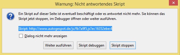 Ich habe bei Firefox das Problem, dass eine bestimme Website, nämlich http://www.autogespot.com, fast immer zum Absturz führt wenn ich sie öffne. In den meisten Fällen wird keine Fehlermeldung angezeigt. Manchmal kriege ich die Meldung dass ein Skript nicht funktioniert (siehe Bild). Manchmal öffnet die Seite sogar ohne Probleme.