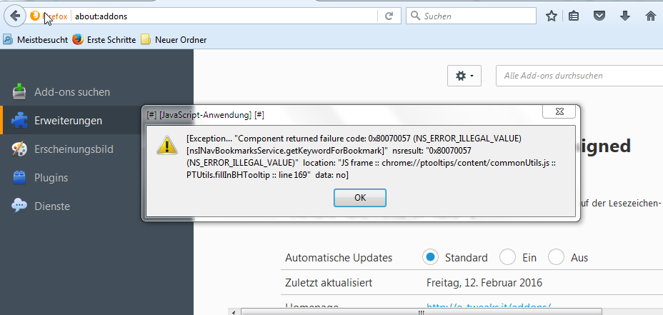 Wenn ich über ein Lesezeichen in der Lesezeichensymbolleiste fahre, passiert gar nix. Wenn ich über einen Link unter "Meistbesucht" fahre kommt folgender Fehler