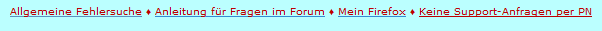 [size=10][url=http://support.mozilla.com/de/kb/Allgemeine+Fehlersuche][color=#BF0000]Allgemeine Fehlersuche[/color][/url][/size] [color=#BF0000][size=10]♦[/size][/color] [size=10][url=http://www.at2907.net/rumpel/wiki/index.php][color=#BF0000]Anleitung für Fragen im Forum[/color][/url][/size] [color=#BF0000][size=10]♦[/size][/color]  [size=10][url=http://www.camp-firefox.de/forum/viewtopic.php?p=537989#p537989][color=#BF0000]Mein Firefox[/color][/url][/size]  [color=#BF0000][size=10]♦[/size][/color]  [color=#BF0000][u][size=10]Keine Support-Anfragen per PN[/size][/color][/u]