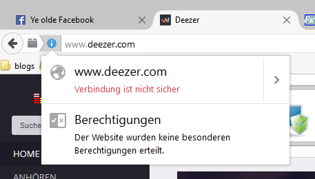 ich habe seit einiger Zeit das Problem, dass Firefox Multimediainhalte auf Seiten nicht widergibt, zum Beispiel Video- oder Audiostreams (siehe Beispiel mit deezer.com). Das äußert sich so, dass betreffende Elemente auf der Seite gar nicht angezeigt werden, oder ein schwarzer Kasten bleibt. Oben links in der Browserzeile wird darüber informiert, dass die "Verbindung nicht sicher" ist. Zunächst dachte ich, es könnte am Flashplayer liegen und das Problem schien nach einer Neuinstallation dessen auch behoben. Allerdings trat es kurz darauf wieder in Verbindung mit obiger Information auf. Ein Starten von Firefox im Safemode brachte keine Veränderung.
