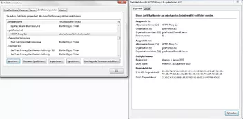 ja klar. Hab ich ja oben schon erwähnt. Die Firewall macht einen Man in the Middle und zertifiziert mit ihrem eigenen Zertifikate.