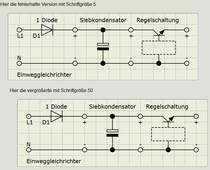 Vielleicht brauche ich ja auch nur etwas Zuspruch oder Mitleid ;) weil ich nun meine schönen Zeichnungen überarbeiten darf. Alle Werte und Positionen mal 10 (eine 0 dranhängen) und die Schriftgröße von 5px auf 50px umstellen. Das geht ja noch, der Rest wird dann ja wieder scaliert. Aber da denkt doch keiner dran, daß die Mindestschriftgröße auch in SVG-Grafiken gilt! Und merken tut man es rerst wenn man selbst mal die Mindestschriftgröße zum Test festlegt.