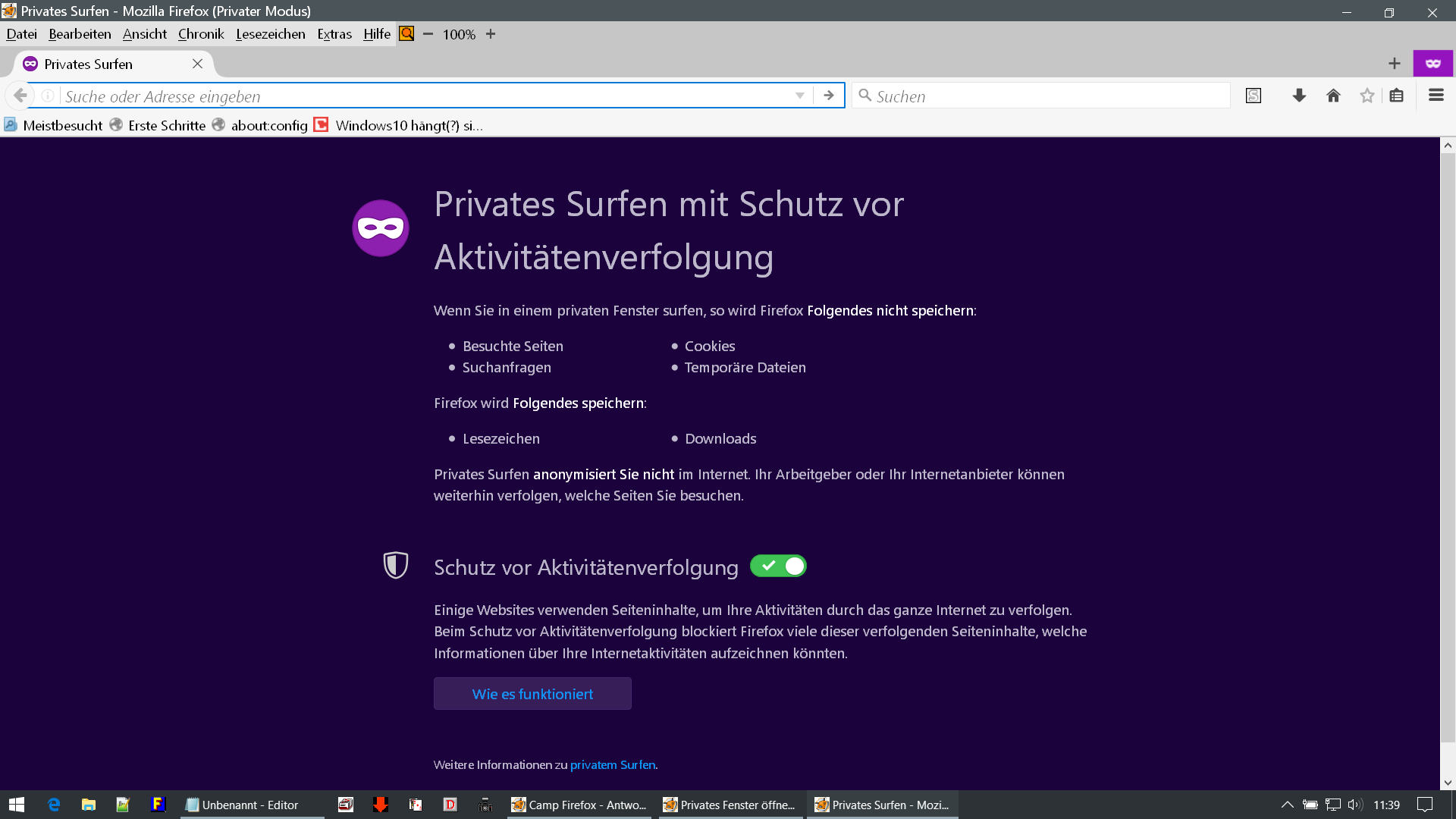 ja genau dieses Fenster meine ich, was auch geöffnet wird, wenn ich "about:privatebrowsing" eingebe und die Enter-Taste betätige. Wenn ich anschließend ein neues privates Fenster öffne, erscheint dort das violette Maskensymbol nach wie vor nicht.