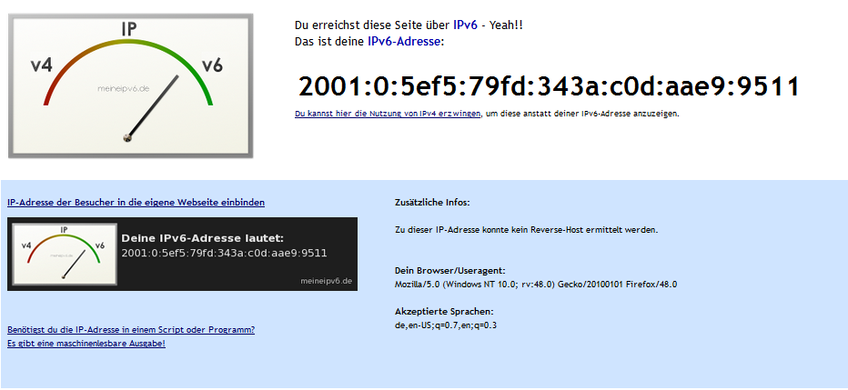 ZitatEs scheint, als hätten Sie nur eine IPv4-fähige Internetverbindung. Sie werden nicht in der Lage sein, Webseiten, welche nur via IPv6 verfügbar sind, zu erreichen.