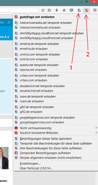 Leider ist es gerade bei solchen Seiten (oft Seiten von Onlinemedien oder Fernsehsendern) ziemlich unmöglich, die erforderlichen Scripte freizugeben, weil viele von denen in der Liste immer nur sehr kurz während des ladens der Seite auftauchen und sofort wieder verschwinden. So schnell kann man kaum lesen, von welcher Domain die kommen, geschweige denn, daß man sie per Click temporär erlauben könnte.
