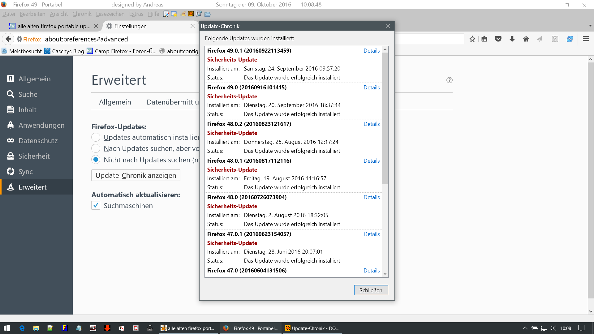 moin, kurze frage wieso updaten sich alle meine alten firefox portablen Versionen nur bis zur 47.0.1