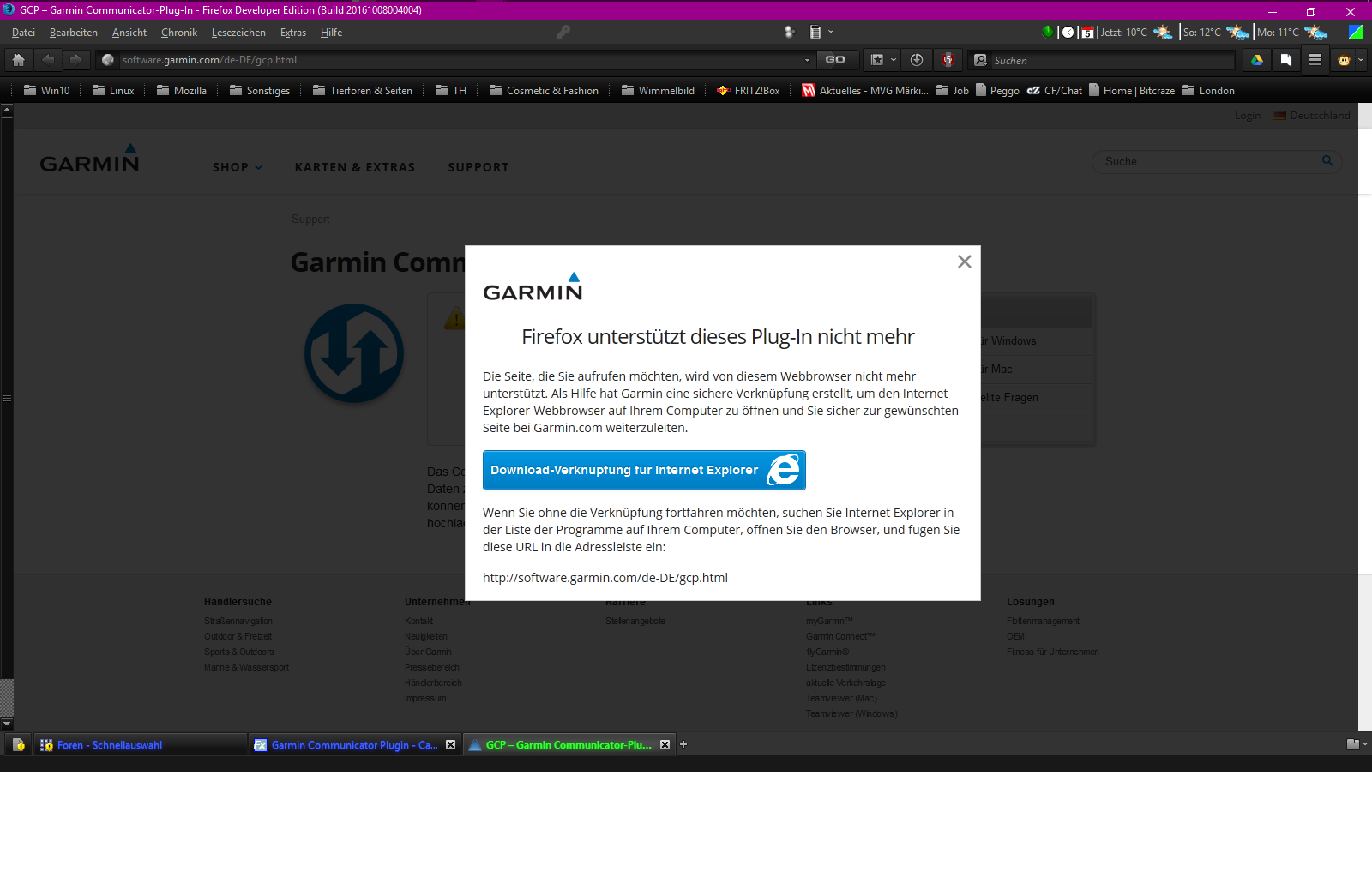 • Hab die neueste Version von Firefox und will den Garmin Communicator zum übertragen von Geocache Dateien auf mein GPS nutzen. Was aber nicht klappt. Hatte in den Plugins in der Add-ons Verwaltung das auf "immer aktivieren" gestellt aber jedesmal den Hinweis bekommen das das nur mit Internet Explorer funktioniert. Das klappt aber auch nicht weil ich mit Windows 10 den Microsoft Egde Browser habe.