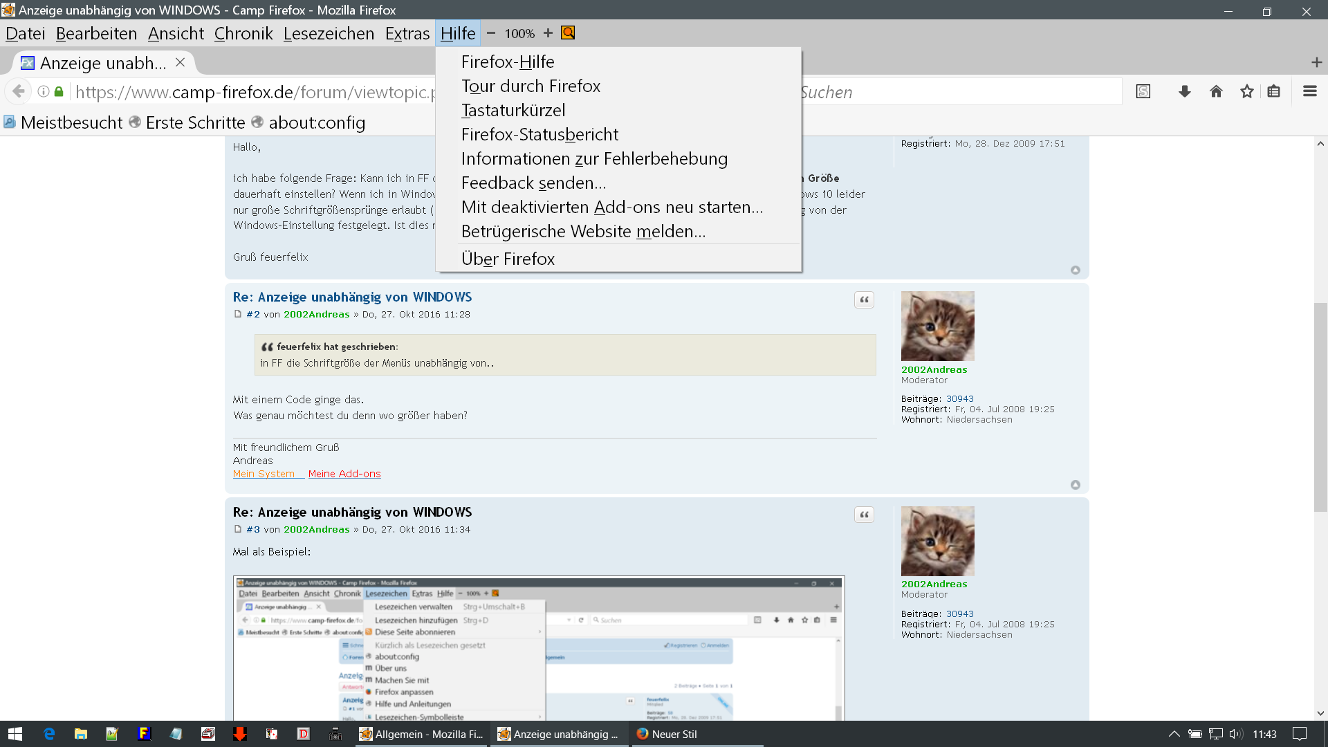 ich habe folgende Frage: Kann ich in FF die Schriftgröße der Menüs unabhängig von der in Windows eingestellten Größe dauerhaft einstellen? Wenn ich in Windows 125% einstelle, sind die Kacheln auf meinem Desktop zu groß. Da Windows 10 leider nur große Schriftgrößensprünge erlaubt (100, 125, 150, 175 und 200%), hätte ich die Anzeige in FF gerne unabhängig von der Windows-Einstellung festgelegt. Ist dies möglich?