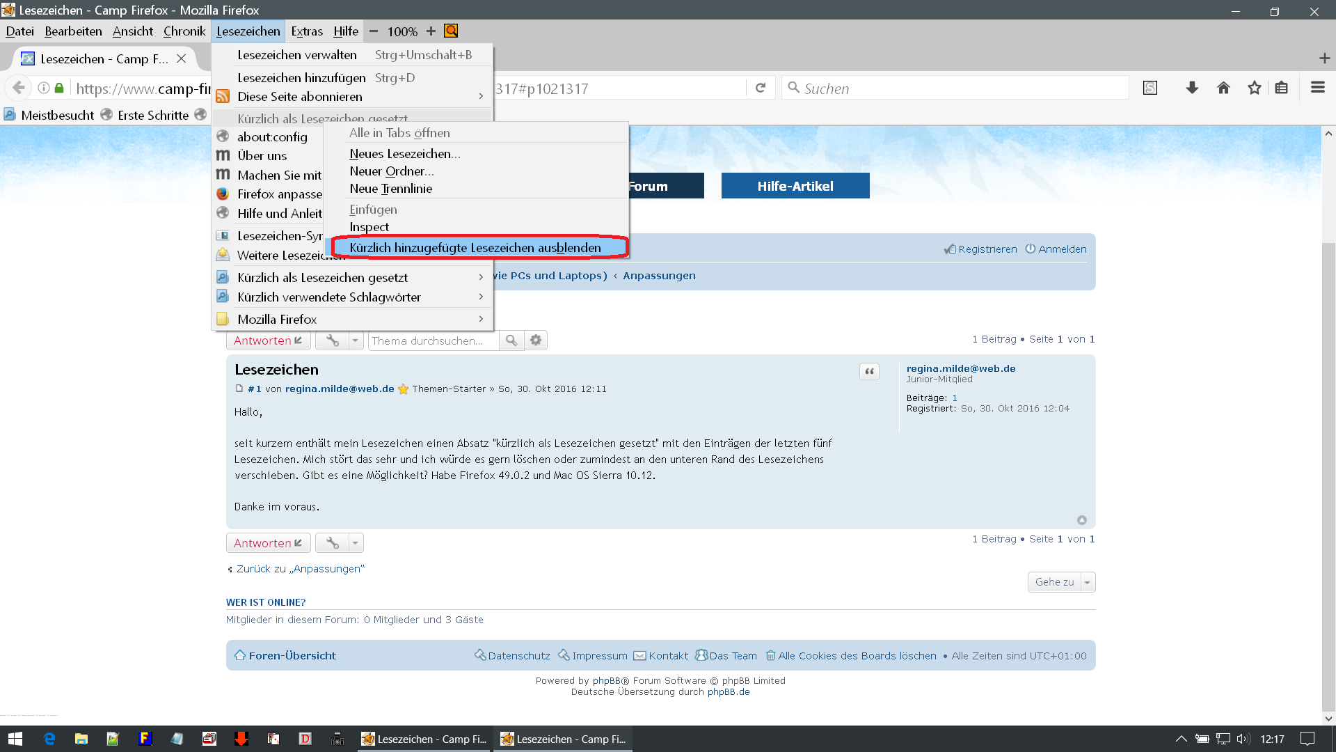 seit kurzem enthält mein Lesezeichen einen Absatz "kürzlich als Lesezeichen gesetzt" mit den Einträgen der letzten fünf Lesezeichen. Mich stört das sehr und ich würde es gern löschen oder zumindest an den unteren Rand des Lesezeichens verschieben. Gibt es eine Möglichkeit? Habe Firefox 49.0.2 und Mac OS Sierra 10.12.