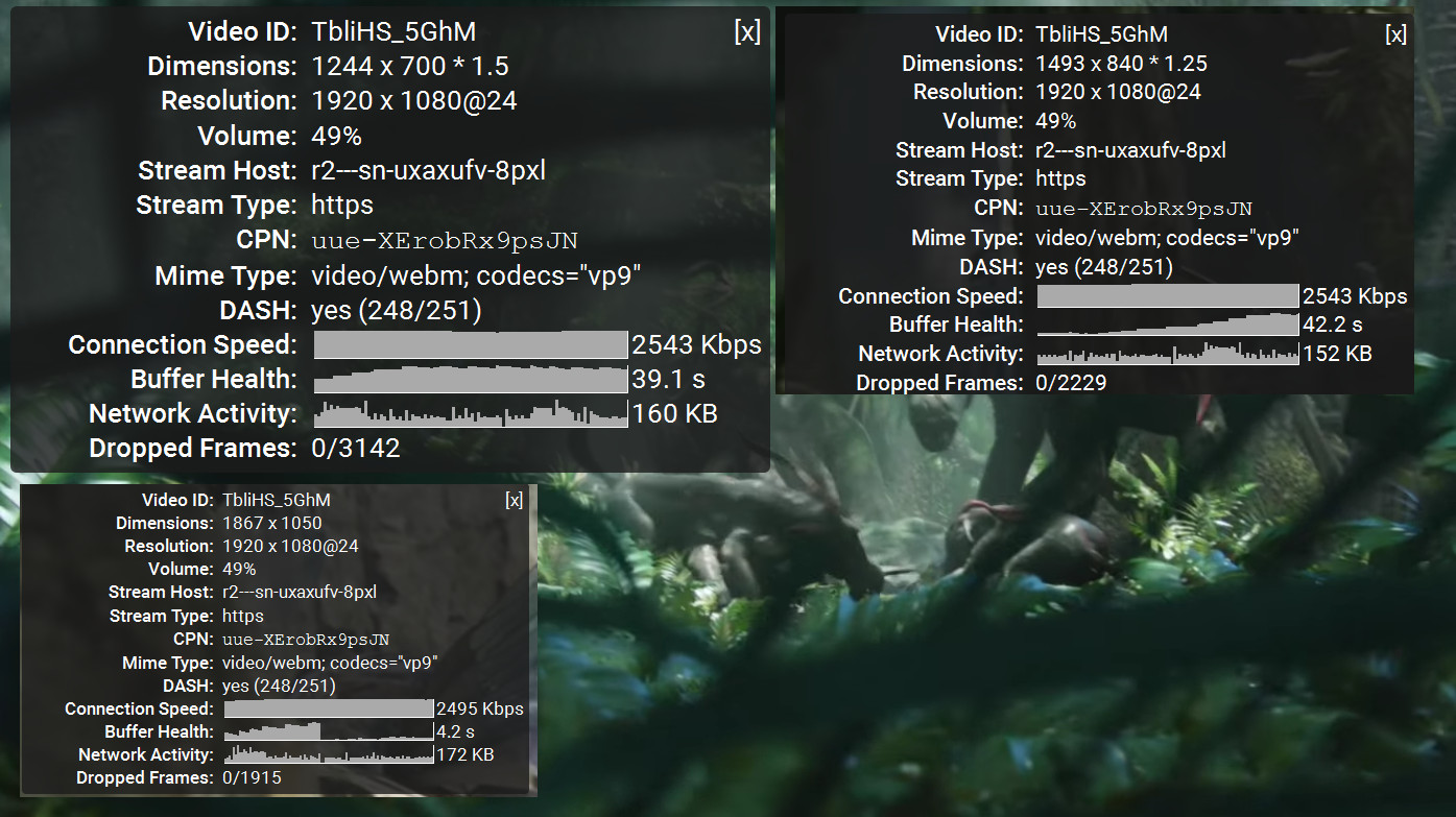 Man sieht, je größer der Zoomfaktor, desto kleiner die verwendete Auflösung unter "Dimensions", die dann auf Vollbildgröße hochskaliert wird. Auch die Größe des Fensters, das die Daten des Videos anzeigt, ändert sich. Firefox behält also den Zoom auch im Vollbildmodus bei. Mein Desktopmonitor hat eine native Auflösung von 1867 x 1050, falls die Frage aufkommt, warum bei Verwendung von 1.0 unter "Dimensions" keine FullHD Auflösung steht. Beim Notebook steht in diesem Fall unter "Dimensions" 1920x1080 und das Video wird pixelgenau abgespielt.