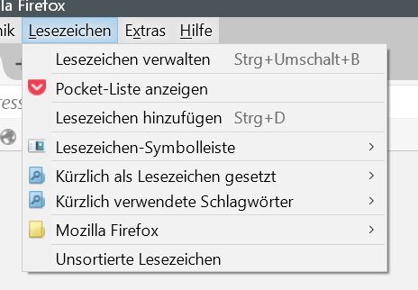 Alles anzeigen@-moz-document url-prefix(chrome://browser/content/browser.xul){ menuitem[label="Kürzlich als Lesezeichen gesetzt"], #menu_bookmarkThisPage, menuitem[label="Lesezeichen für alle Tabs hinzufügen…"], menu[class="menu-iconic"][label="Diese Seite abonnieren"], menu[label="Weitere Lesezeichen"], menu[class="menu-iconic bookmark-item"][label="Lesezeichen-Symbolleiste"], menu[container="true"][query="true"][class="menu-iconic bookmark-item"][label="Kürzlich als Lesezeichen gesetzt"], menu[container="true"][query="true"][class="menu-iconic bookmark-item"][label="Kürzlich verwendete Schlagwörter"], #bookmarksMenuPopup > menuseparator:nth-child(n+5){ display:none!important;}}Sieht dann so aus: