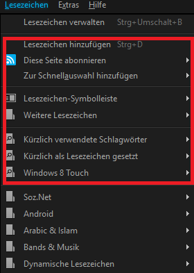 Alles anzeigen@-moz-document url-prefix(chrome://browser/content/browser.xul){ menuitem[label="Kürzlich als Lesezeichen gesetzt"], #menu_bookmarkThisPage, menuitem[label="Lesezeichen für alle Tabs hinzufügen…"], menu[class="menu-iconic"][label="Diese Seite abonnieren"], menu[class="menu-iconic"][label="Diese Seite abonnieren…"], menu[class="menu-iconic"][label="Diese Seite abonnieren"][observes="multipleFeedsMenuState"], #subscribeToPageMenupopup, menu[label="Weitere Lesezeichen"], menu[class="menu-iconic bookmark-item"][label="Lesezeichen-Symbolleiste"], menu[container="true"][query="true"][class="menu-iconic bookmark-item"][label="Kürzlich als Lesezeichen gesetzt"], menu[container="true"][query="true"][class="menu-iconic bookmark-item"][label="Kürzlich verwendete Schlagwörter"], #bookmarksMenuPopup > menuseparator:nth-child(n+5){display:none!important;} }Mfg.