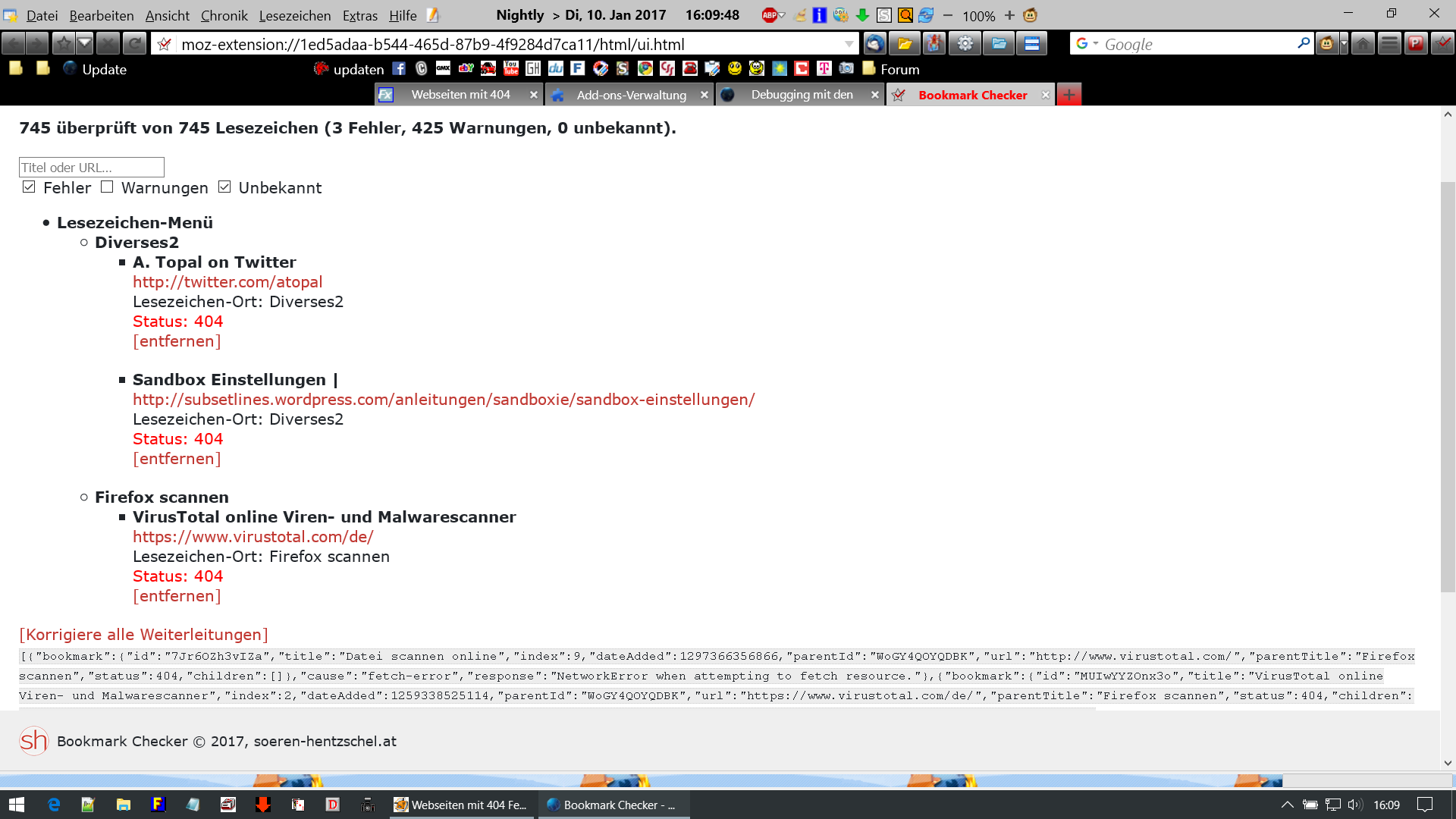 [{"bookmark":{"id":"7Jr6OZh3vIZa","title":"Datei scannen online","index":9,"dateAdded":1297366356866,"parentId":"WoGY4QOYQDBK","url":"http://www.virustotal.com/","parentTitle":"Firefox scannen","status":404,"children":[]},"cause":"fetch-error","response":"NetworkError when attempting to fetch resource."},{"bookmark":{"id":"MUIwYYZOnx3o","title":"VirusTotal online Viren- und Malwarescanner","index":2,"dateAdded":1259338525114,"parentId":"WoGY4QOYQDBK","url":"https://www.virustotal.com/de/","parentTitle":"Firefox scannen","status":404,"children":[]},"cause":"fetch-error","response":"NetworkError when attempting to fetch resource."},{"bookmark":{"id":"8jqz2K3QRw6v","title":"Hauptseite - MDC","index":5,"dateAdded":1237811953781,"parentId":"objMn_DAs38n","url":"https://developer.mozilla.org/de","parentTitle":"css","status":404,"children":[]},"cause":"fetch-error","response":"NetworkError when attempting to fetch resource."}]