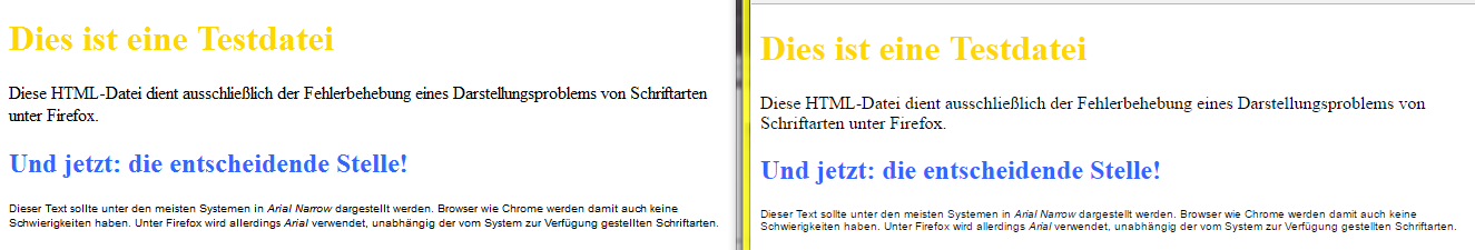 Es ist nicht sinnvoll, das Wichtige – hier den Test, ob Arial Narrow angezeigt wird – in einen Abschnitt mit sehr kleiner Schrift zu verlegen. Zusätzlich fehlte noch die Arial als Vergleich, damit man es leichter sieht. Und das hier ist einfach falsch