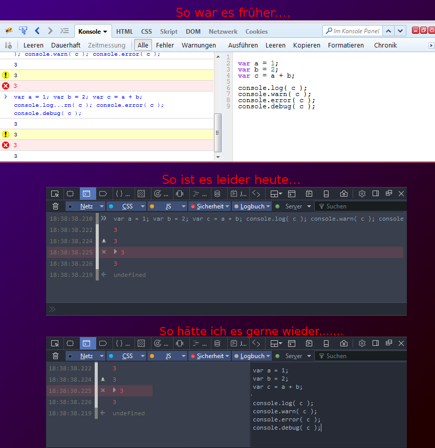 Das man die einzeile Console mit einem Klick Multilinefähig machen konnte. Sie somit auf die rechte Seite im FB setzen konnte, während man auf der linken Seite die http://console.log/debug/usw/Fehlermeldung sehen konnte.