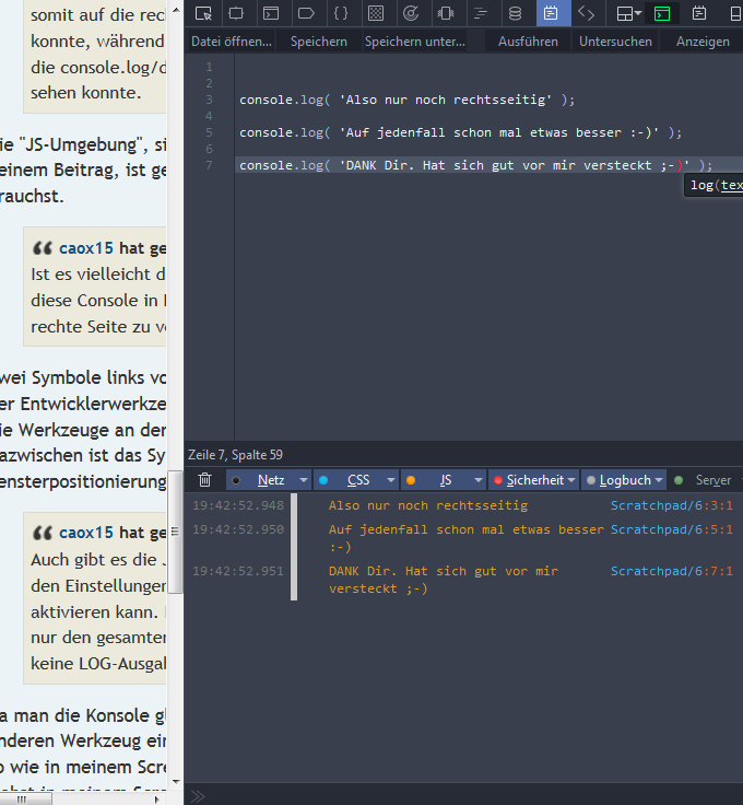 Auch gibt es die JS-Umgebung, die man in den Einstellungen als Reiter in den Devs aktivieren kann. Doch dieses nimmt wieder nur den gesamten Bereich ein, so dass man keine LOG-Ausgaben verfolgen kann ![]()