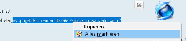 CSSmenuitem[label="Alles markieren"] { -moz-binding: url("chrome://global/content/bindings/menu.xml#menuitem-iconic") !important; list-style-image: url("file:///C:/Users/Andi/Icons/31.gif") !important; padding-left:4px!important} menuitem[label="Alles markieren"]>.menu-iconic-text{ padding-left:4px !important;}Wenn ich das Bild gegen einen Base64 Code austausche sieht es so aus: