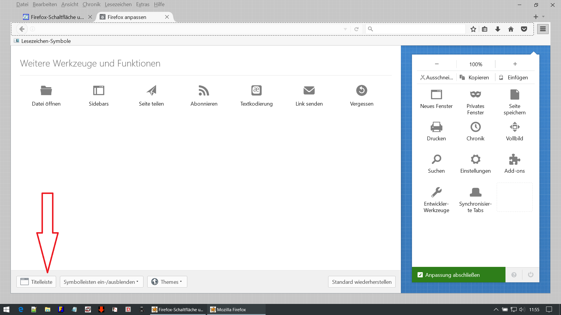 Die 2 Sachen habe ich gemacht. Titelleiste unter Anpassen entfernen. Orangene Firefox-Schaltfläche verschwindet dann auch ja, aber die Titelleiste an sich (wo der Name der jeweiligen Seite wie zb Camp FIrefox drinsteht) wo man das Fenster minimieren, maximieren,schließen kann bleibt - wieso sollte es auch weggehen? Denn dann könnte man ja Firefox nicht mehr schließen.
