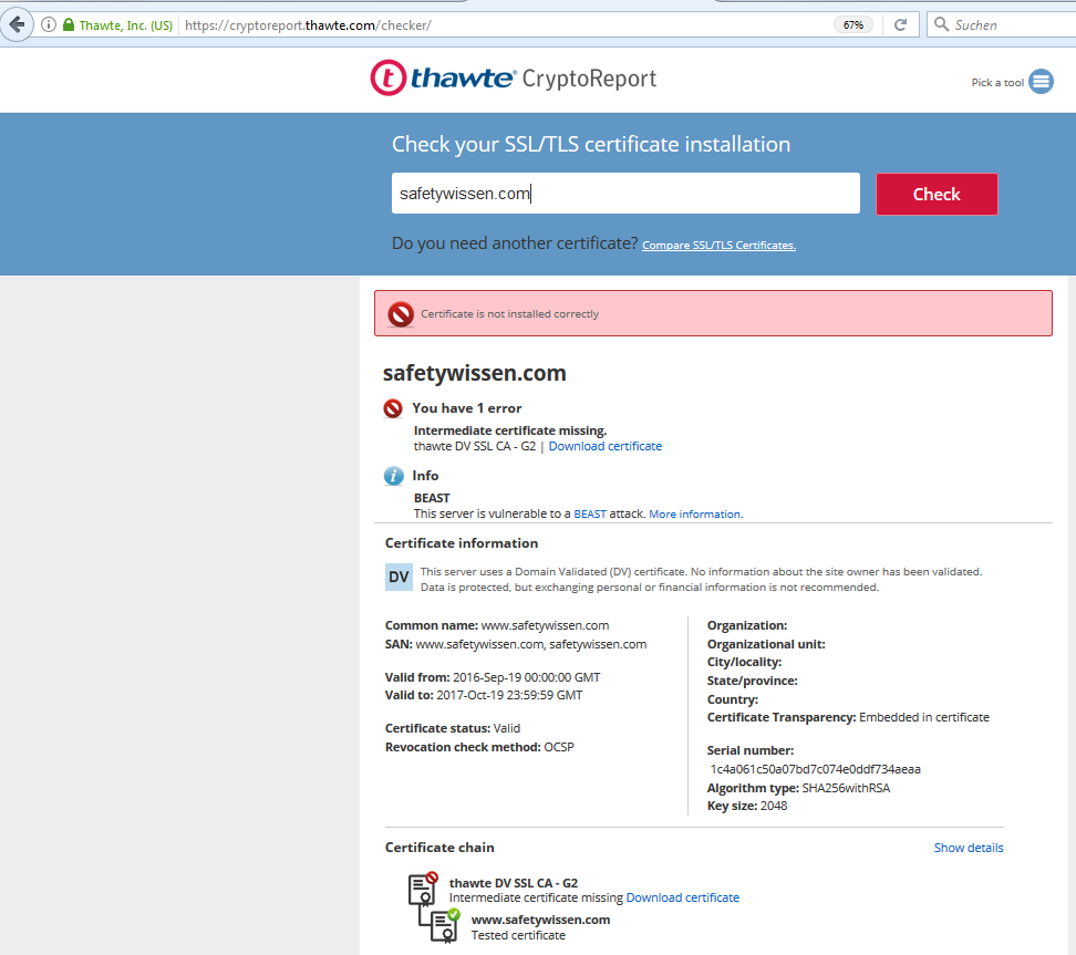 http://www.safetywissen.com verwendet ein ungültiges Sicherheitszertifikat. Dem Zertifikat wird nicht vertraut, weil das Aussteller-Zertifikat unbekannt ist. Der Server sendet eventuell nicht die richtigen Zwischen-Zertifikate. Eventuell muss ein zusätzliches Stammzertifikat importiert werden.