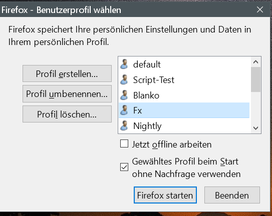 • Ich lege neue Profile auch mit dem Profilmanager an (firefox.exe -p) aber genau danach erscheint das, was Andreas zeigt, doch auch, also die Seite https://www.mozilla.org/de/firefox/52.0.1/firstrun/ :-???