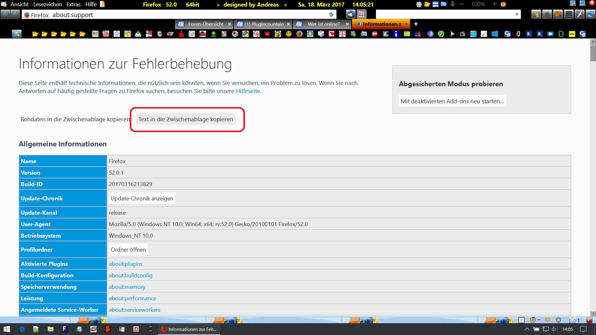Unter Hilfe => Informationen zur Fehlerbehebung den Inhalt des Feldes durch Drücken des Buttons