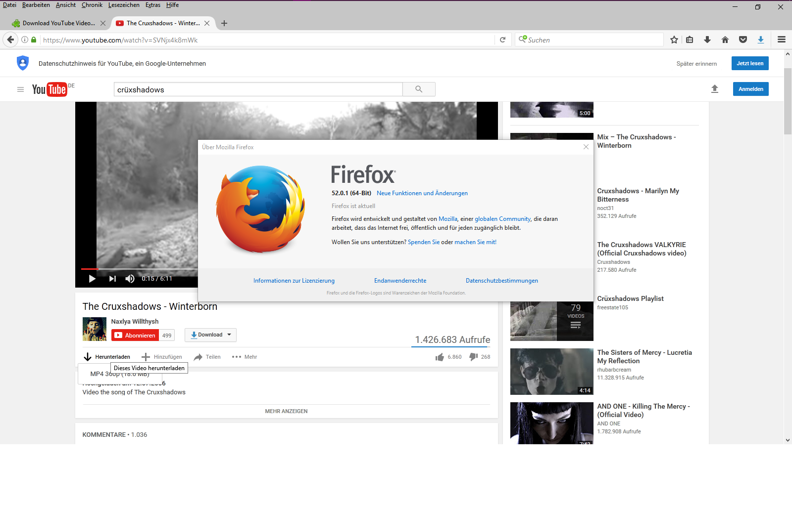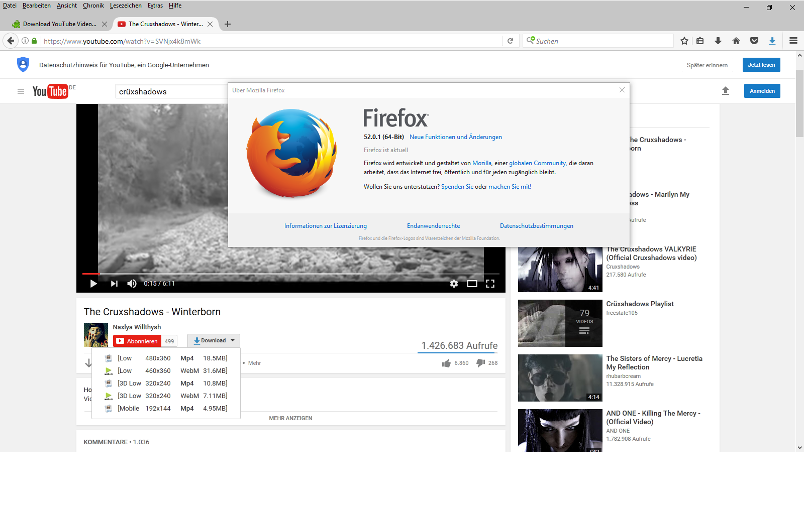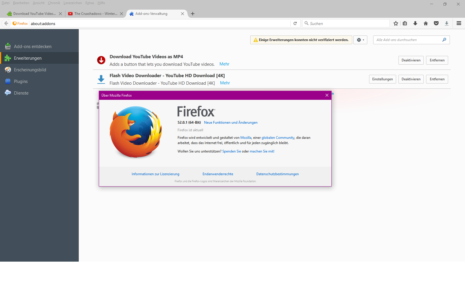 ...dann die Opera und Firefox 64bit Versionen frisch inst. und siehe da, schon wieder funktionieren die addons nicht, ...Also bei mir im 64'er Firefox 52.0.1 funktionieren die Erweiterungen Flash Video Downloader - YouTube HD Download [4K] 15.0.11 und Download YouTube Videos as MP4 1.8.10. Getestet mit einem frischen neuen Profil und mit aktiviertem Multiprozess (1/1) :