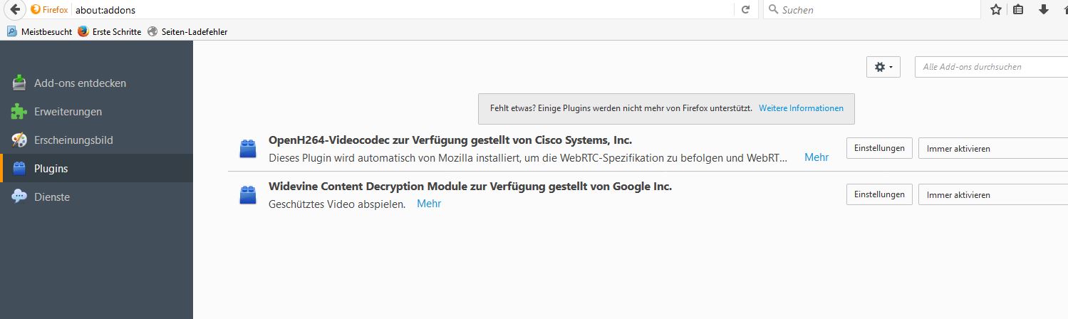 unter addons plugin-verwaltung finde ich den den flashplayer nicht. lediglich diese beiden addons sind vorhanden.