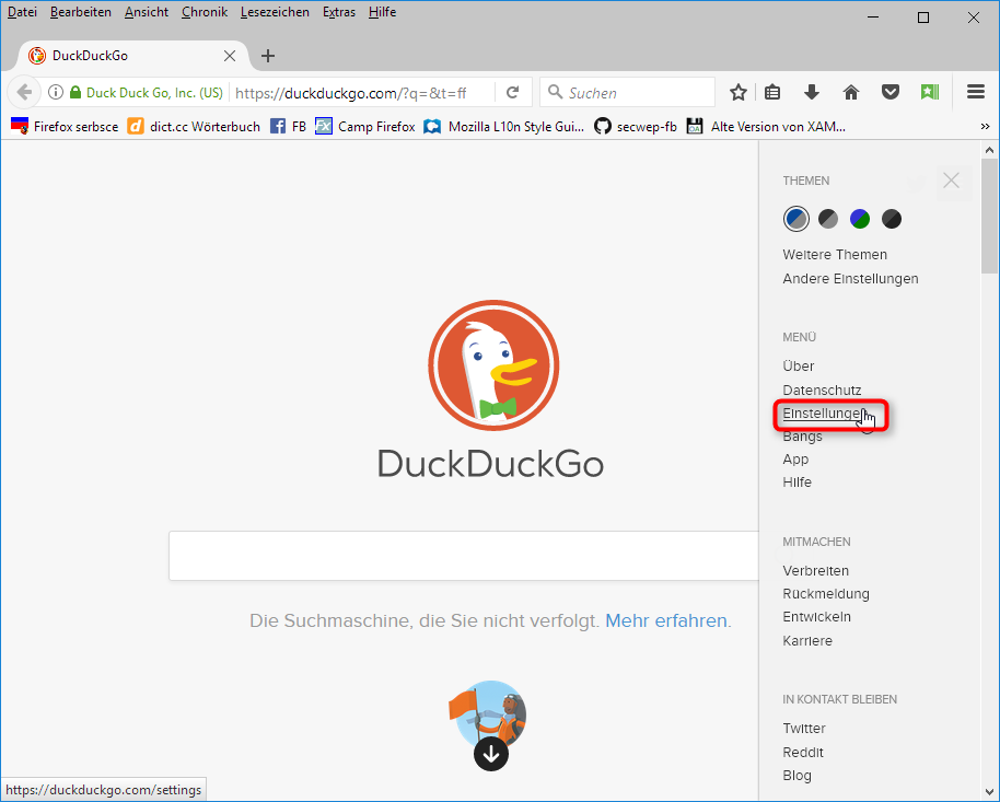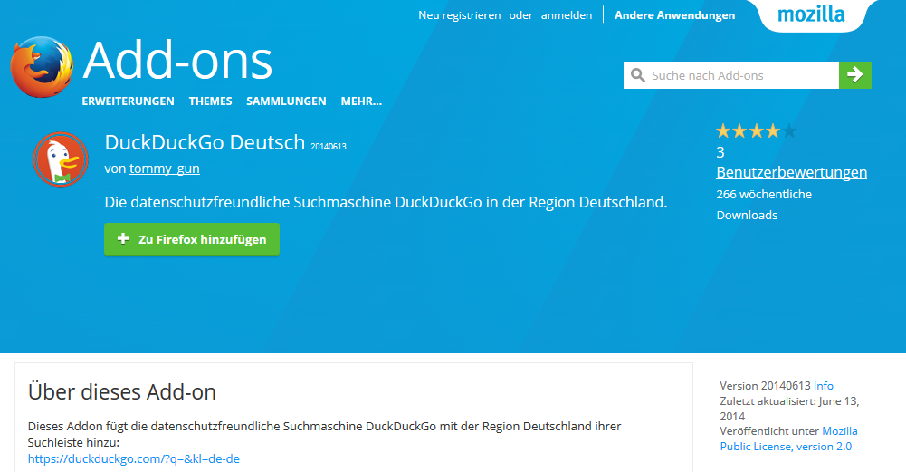 seit Kurzem habe ich ein Problem mit DuckDuckGo. Ich habe über die Add-On-Seite von Firefox die deutsche Fassung von DuckDuckGo installiert. Bei Einstellungen steht sie unter den Suchmaschinen an erster Stelle, und zwar als DuckDuckGo de.