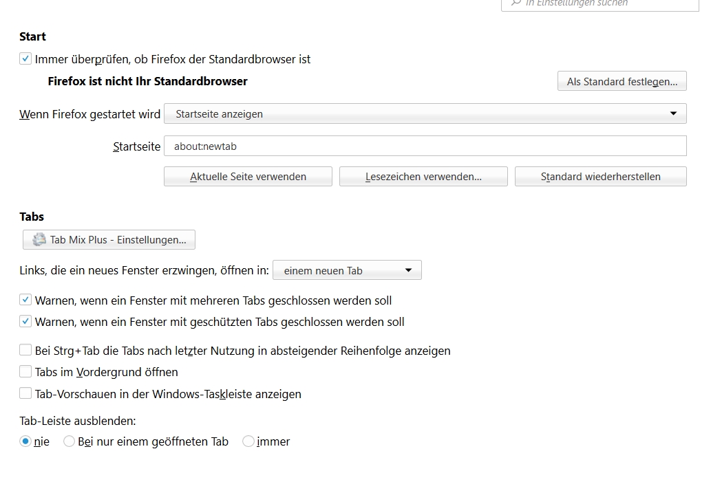 Diese Einstellung (about:newtab) läuft hier auch mit aktiviertem Tab Mix Plus.