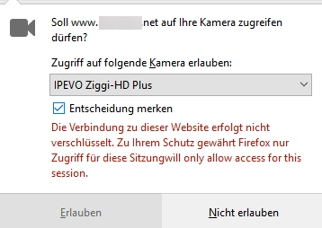 Da die Webapp in einer Session öfters auf die Kamera zugreift, muss die Entscheidung "gemerkt" werden was FF allerdings wegen fehlendem HTTPS nicht erlaubt. Siehe Anhang "Meldung2.png".