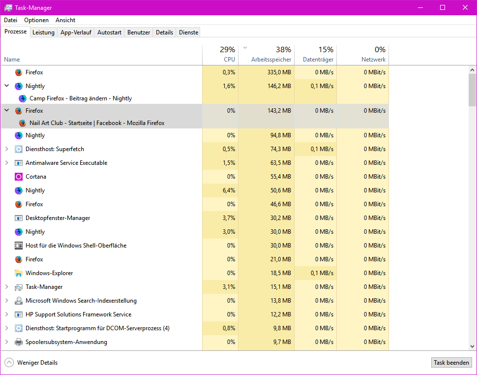 Stand heute - die Firefox-Instanzen laufen angenehm flott. Ich habe zwischenzeitlich einmal alle Instanzen neu gestartet. Nicht weil die Firefox-Instanzen sich aufgehängt haben, sondern weil ich die Reihenfolge der Anwendungen in der Taskleiste ändern wollte.