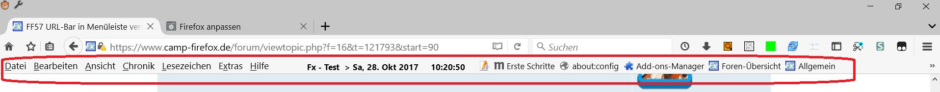 Wenn ich Menubar in die Navbar verschiebe und ff neustarte, spring die dann nach oben, in die Menüleiste, und ich kann die nicht mehr verschieben. Bitte um Hilfe.