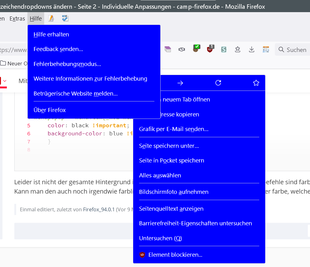 Alles anzeigenmenupopup::part(arrowscrollbox) { background-color: blue !important; } #PlacesToolbar menupopup[placespopup="true"]::part(arrowscrollbox) { background-color: blue !important; } menupopup :is(menuitem,menu) { color: white !important; } menupopup :is(menu,menuitem):hover { background-color: red !important; }Danke für den Code. Nun funktioniert alles so weit wie ich es aktuell brauche.