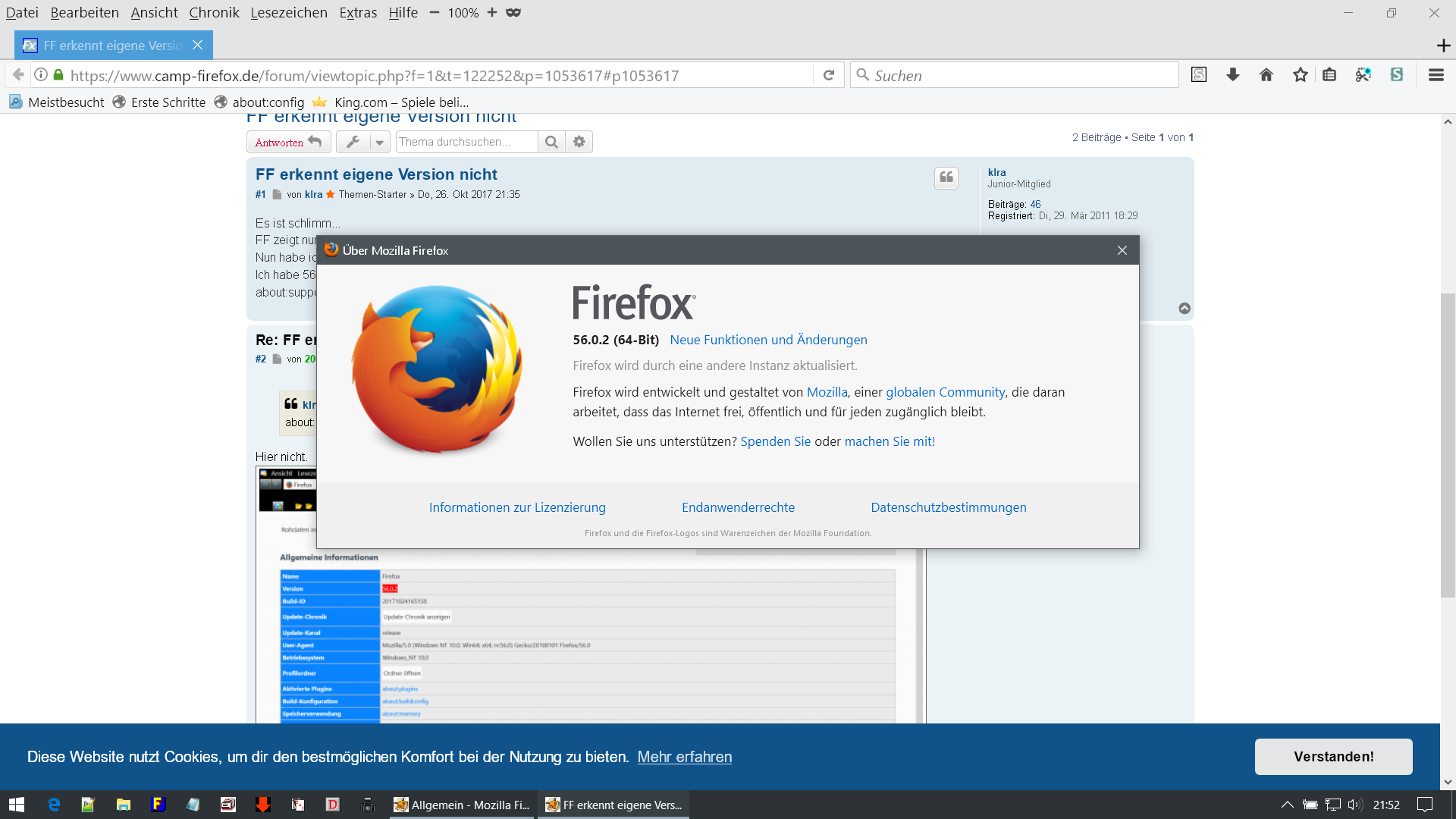 Nun habe ich 56.0.2 frisch installiert und FF nervt weiterhin mit "Eine neue Version ist da"...